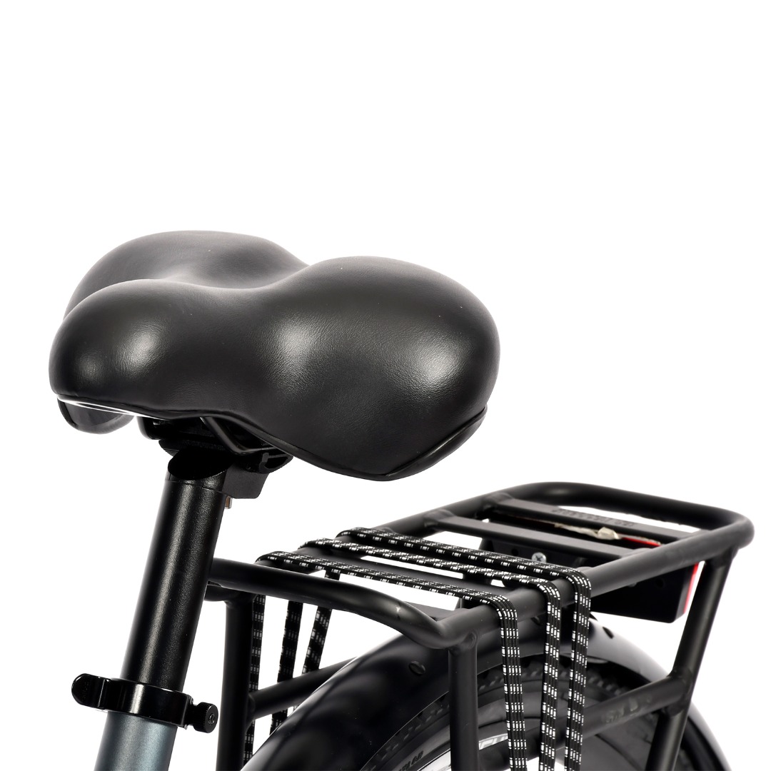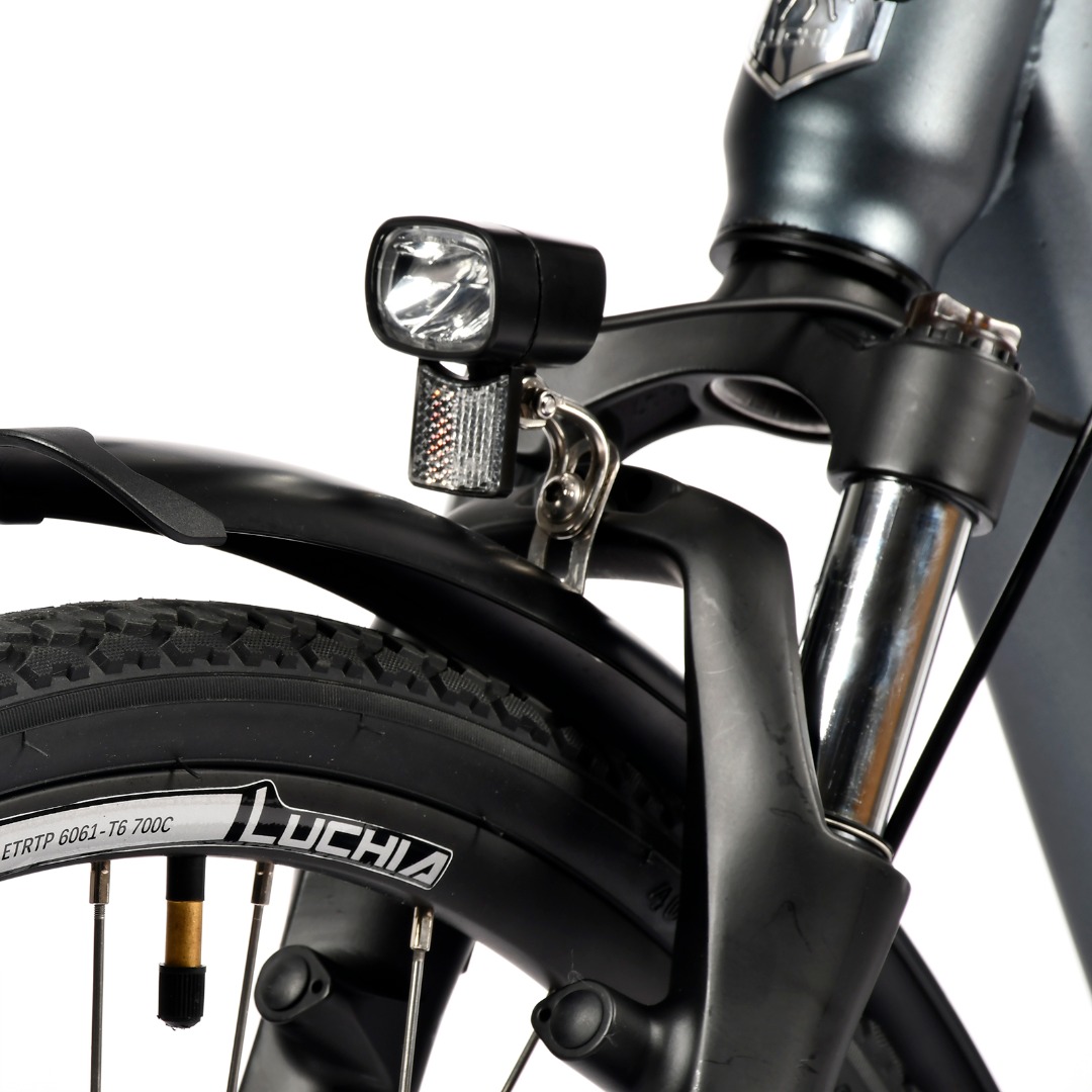 Il dispose aussi de tous les accessoires nécessaires comme : éclairage LED avant et arrière, porte-bagage arrière intégré au cadre, garde-boue, protège chaine, béquille et sonnette.