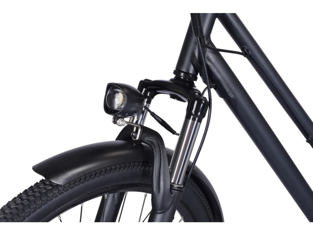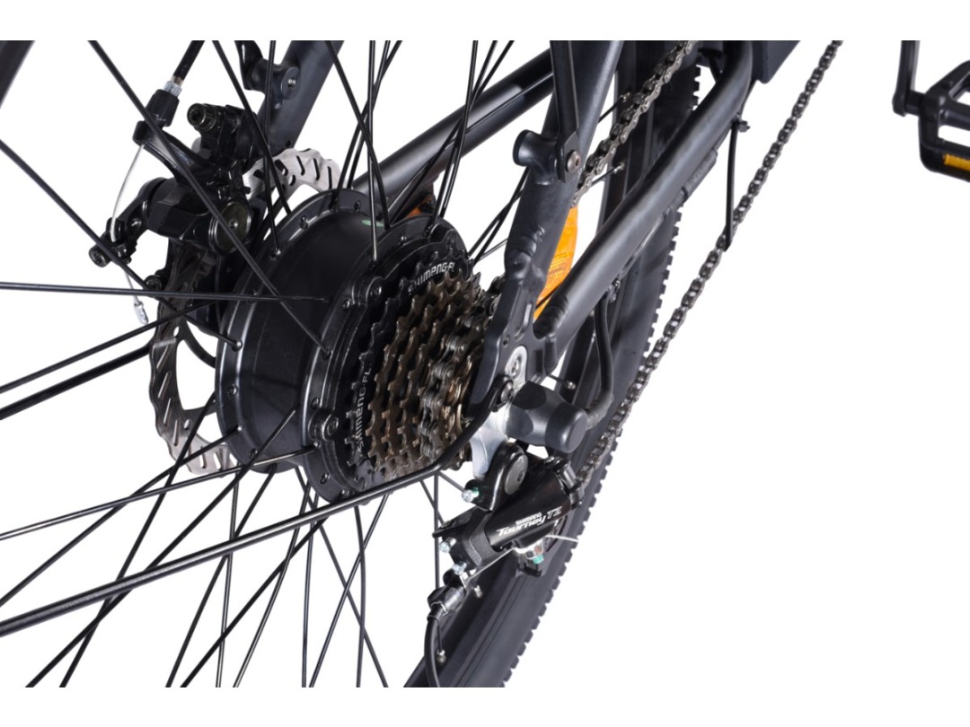 Sa batterie 18650 Lithium amovible de 36V 10Ah offre une autonomie de 35 kms et se recharge en à peine 4h. Il dispose de trois modes de conduite : mode électrique pur, mode assistance et mode pédalage. Il dispose de 7 vitesses (dérailleur marque Shimano) de suspensions avant et de freins à disque.