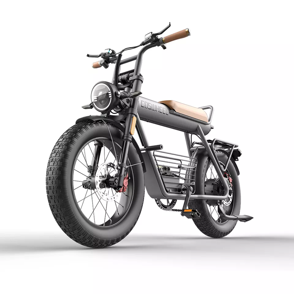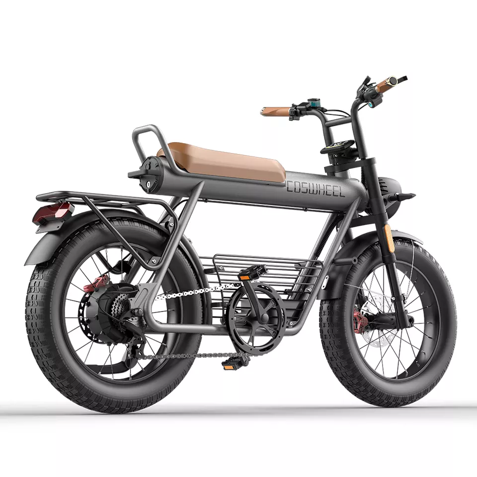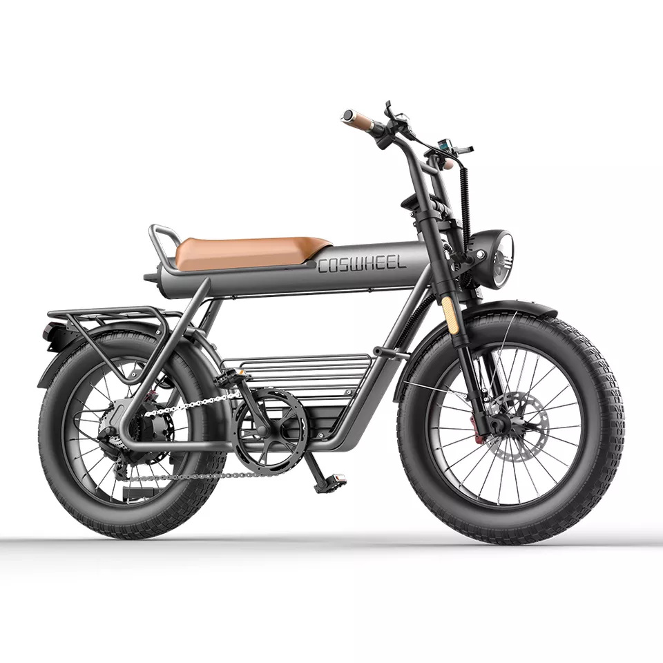 Un look de moto vintage, le vélo électrique COSWHEEL CT20 dispose d’un design racé par rapport aux vélos électriques classique. L’aspect baroudeur et tout-terrain est immédiatement visible à l’aide des larges roues crantées et du cadre d’une forme unique.